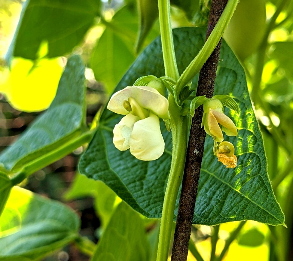 Paired greenish-white flowers of Japanese Tora-mame common bean (Phaseolus vulgaris) July 29, 2025, Saanich Peninsula. Photo Christopher Hebda.