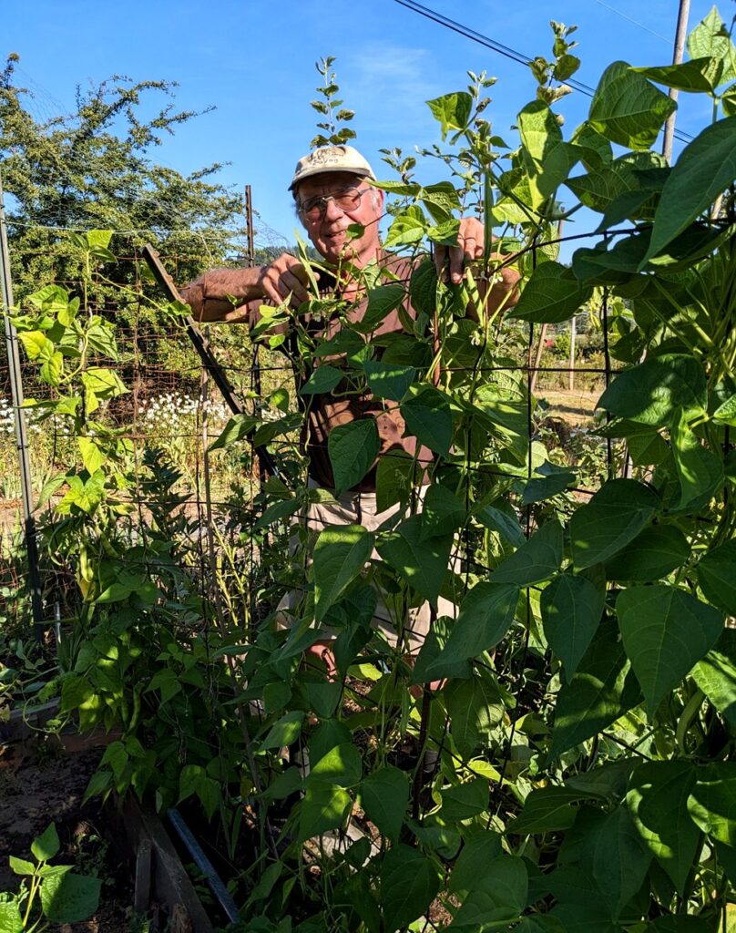 Robust climbing plants of Tora-mame common bean (Phaseolus vulgaris) with numerous buds and first flowers, Saanich Peninsula, July 28, 2025. Photo Christopher Hebda.