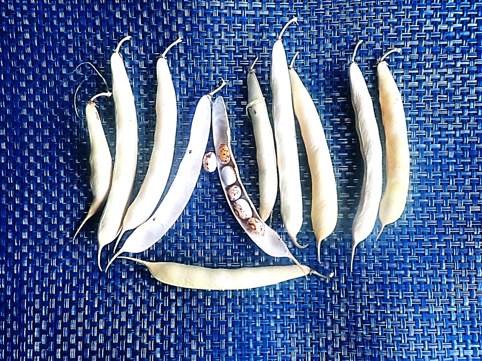 Dried pods of Tora-mame common bean (Phaseolus vulgaris) with one on the right showing strongly defined suture. Photo Richard Hebda.