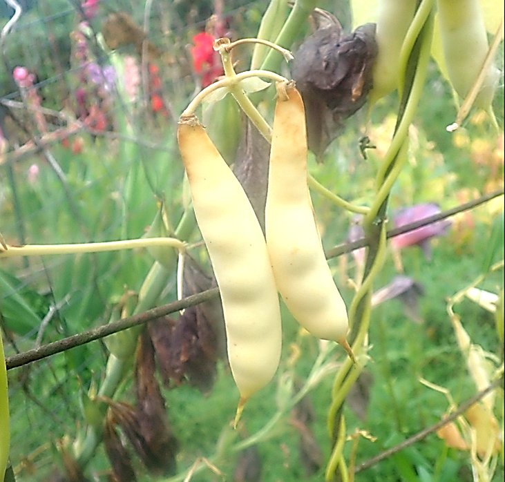 Pair of ripening pods on a Tora-mame common bean (Phaseolus vulgaris) plant. Most of the leaves have been shed indicating the determinate growth of this variety. Saanich Peninsula, August 12, 2024. Photo Richard Hebda.