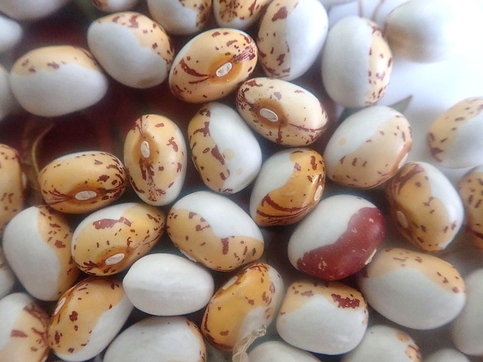 Seeds of Tora-mame common bean (Phaseolus vulgaris) with their artful decoration. Though generally with an oval outline, several show the flattened and angled end developed in a tightly filled pod. Photo Richard Hebda.