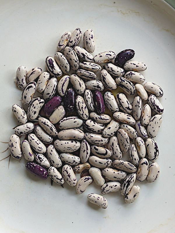 Typically, five (4-6) seeds fill the pod. Seeds have a shiny white base colour dotted by widely spaced purple markings many of which extend into narrow streaks. Markings are obviously purple not maroon as in typical Italian “borlotti” type beans. The bean seeds are strongly kidney-shaped. A long narrow white scar is surrounded by a yellow orange zone. The comparatively large and slightly flattened seeds range from 1.7-1.9cm long (3/4”), stand about 0.9cm (1/3”) high but are only 0.6cm (1/4”) thick.